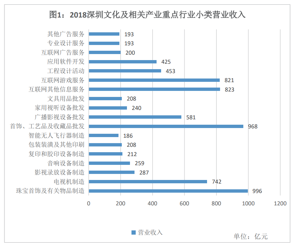 深圳宝安、龙岗、罗湖、盐田等区域,中高附加值文化制造业规模优势突出。具有代表性的包括罗湖的珠宝首饰及工业品制造销售,宝安、龙岗、龙华的文化装备及消费终端制造业。2018年,罗湖、盐田文化及相关产业营业收入分别达到1354亿元、527亿元,两区珠宝首饰及工业品制造销售营收均超过九成。宝安区文化及相关产业总营业收入达1326亿元,文化制造业达1106亿元,占比83%,占全市文化制造业超过三成。文化消费终端生产和文化装备生产营收近千亿,占全区文化产业营收达78%,其中电视机制造、影视录放设备制造、音响设备制造三个小类营业收入最高。龙岗区文化及相关产业营业收入927亿元。文化制造业614亿元,占比66%,营收全市排名第二,其中文化消费终端生产、文化装备生产分别为367亿元、101亿元。其中,龙岗电视机制造、珠宝首饰及有关物品制造、工程设计三个行业营收分别达195亿元、125亿元、78亿元。